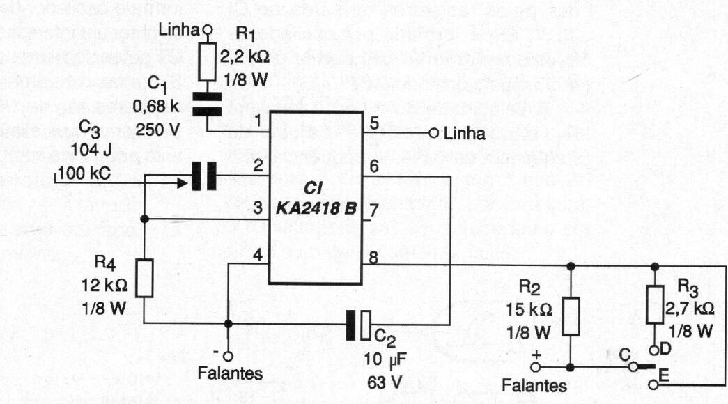 El circuito integrado utilizado en este proyecto de 2002 no es muy común. Está alimentado directamente por la línea telefónica, que no requiere fuente de alimentación. El circuito está conectado directamente a altavoces pequeños.
