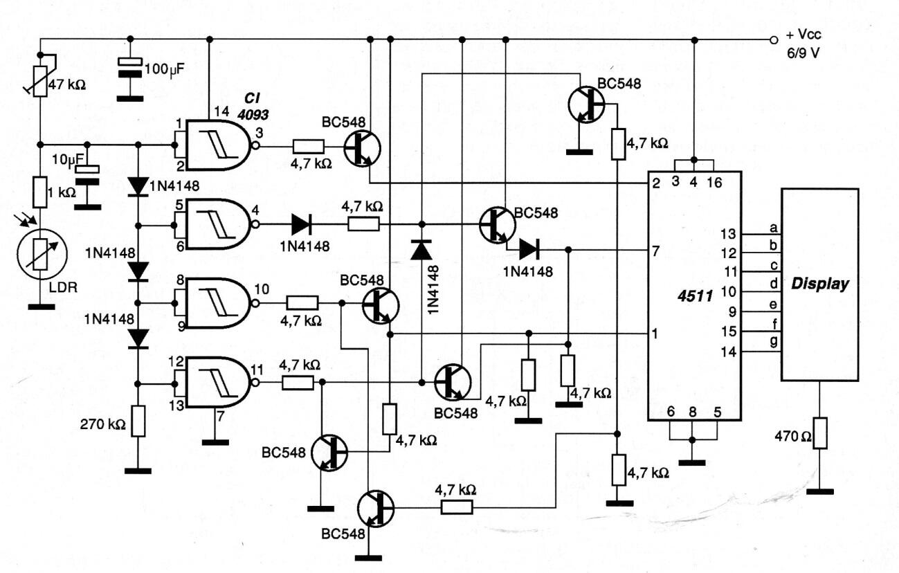 Este circuito indica cuatro niveles de luz, teniendo como sensor un LDR. El trimpot de 47k ajusta la escala. El circuito es de documentación de 2002. La energía puede ser suministrada por voltajes de 6 a 9 V y el display es del tipo de cátodo común.