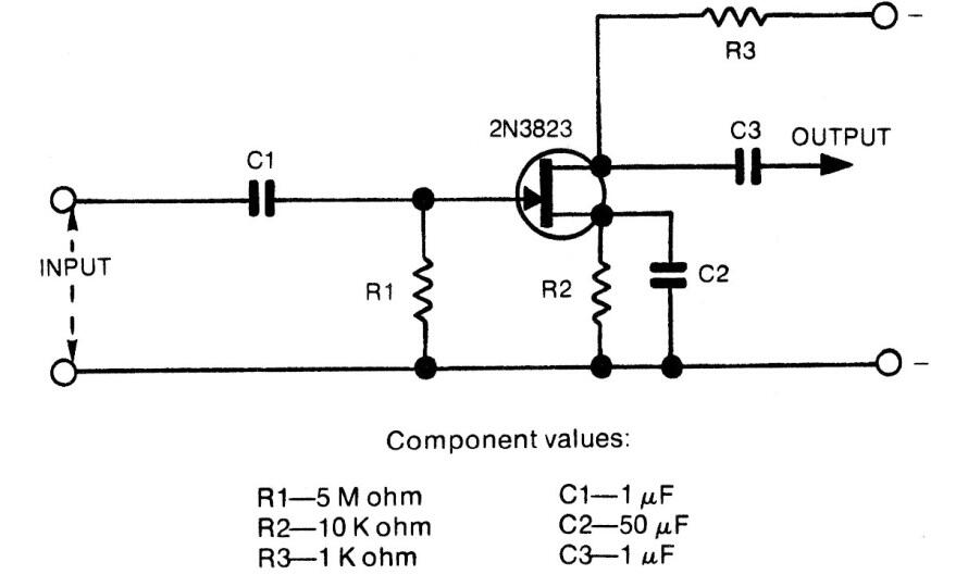 Este buen paso de ganancia se obtuvo de una publicación estadounidense de los años 80. El circuito puede ser alimentado por tensiones de 3 a 9 V y el FET puede ser de casi cualquier tipo. Los valores de los componentes están al lado del diagrama.