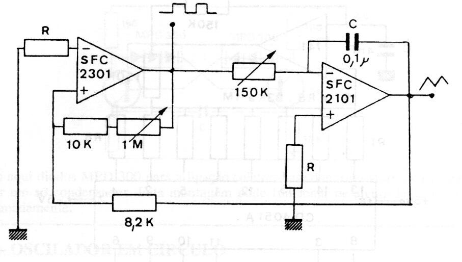 Los operacionales utilizados en este circuito no son muy comunes hoy en día, pero el mismo circuito se puede implementar con operacionales más modernos. El resistor R determina la frecuencia junto con C y el suministro debe hacerse con una fuente simétrica. El circuito genera señales rectangulares y triangulares.