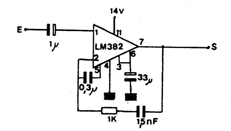 Este circuito de los 80 usa un amplificador operacional inusual hoy en día. El circuito se puede diseñar con operacionales modernos. La ganancia es de 40 dB.