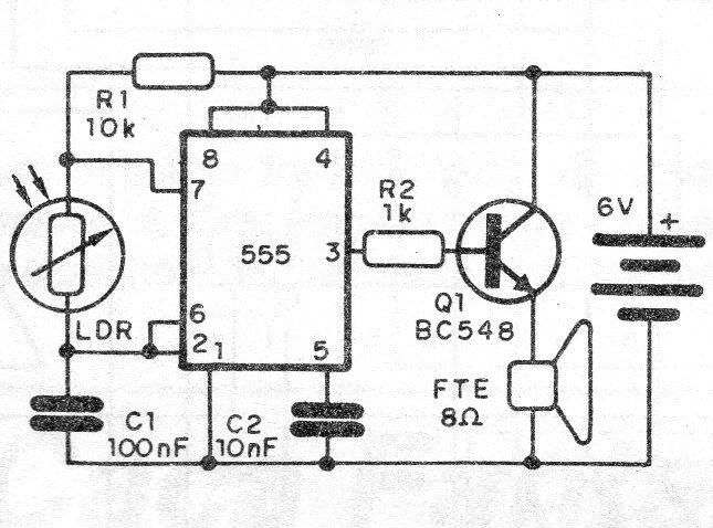 Este tipo de circuito aparece en varias versiones y enfoques en este sitio. Esto se encontró en una documentación de 1991. El circuito puede ser alimentado por tensiones de 3 a 12 V y el capacitor determina el tono de la señal producida.
