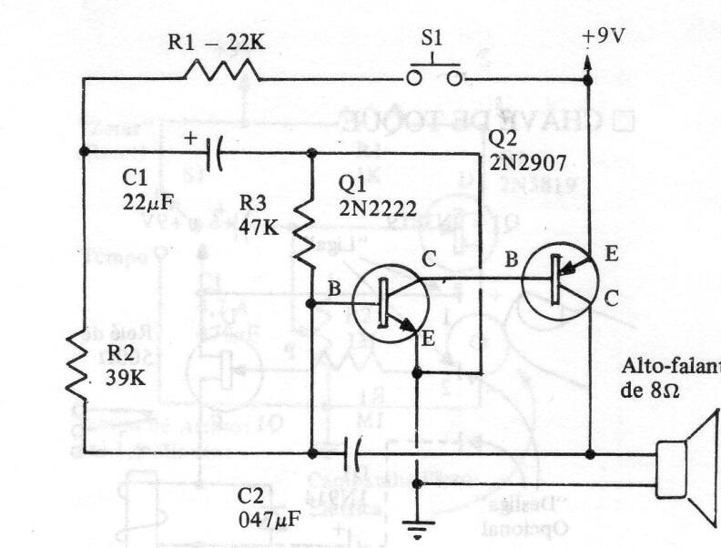 Esta configuración de sirena que se encuentra en la documentación de los años 80 también se puede ver en muchos de nuestros diseños y en este banco de circuitos. Los transistores son comunes, pero Q2 puede ser de mayor potencia. El circuito funciona con tensiones de 3 V o más.