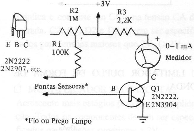 Este circuito es de una documentación estadounidense de los 80. El circuito puede hacer uso de cualquier transistor NPN común y la energía proviene de dos baterías pequeñas. Se pueden usar medidores de 200 uA a 1 mA.