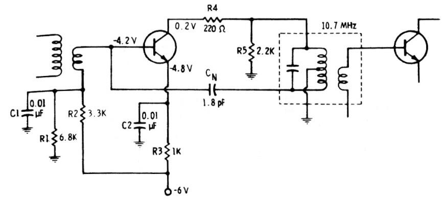 Este es un amplificador FM clásico con configuración de paso de amplificación IF. El circuito es de una documentación de la década de 1980. CN es el capacitor neutralizador.