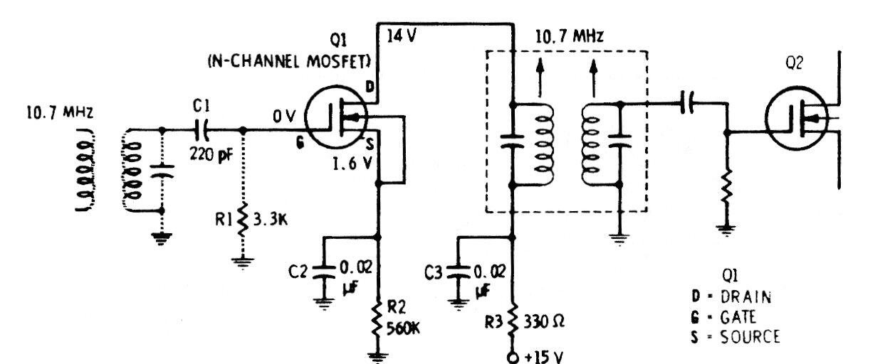 En la figura tenemos un paso de amplificador FI usando un MOSFET. El circuito se encontró en una documentación de la década de 1980, destinada a receptores de FM de la época.