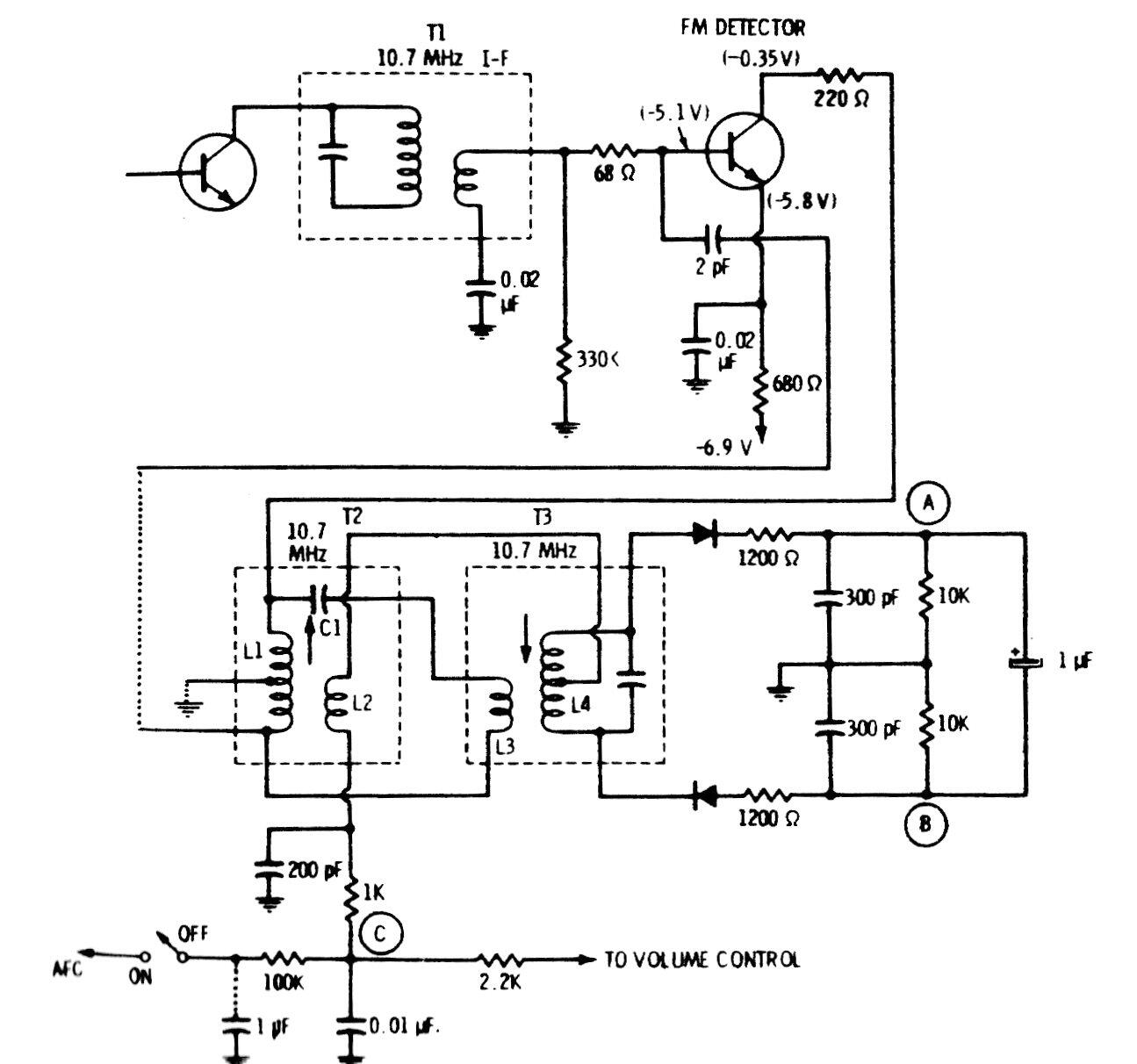 Este circuito se encontró en una documentación de la década de 1980. Es un detector de relación o discriminador para los receptores FM de la época que utilizan las bobinas FI del receptor.