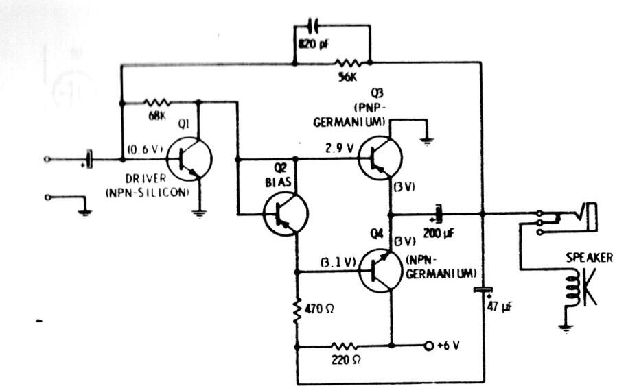 Este circuito de los años 80 utiliza transistores de germanio de la época como el par AD161 y AD162 o AC187 y AC188. Los transistores de salida deben estar equipados con disipadores de calor.