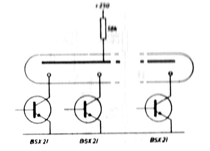 Este circuito de los 80 utiliza transistores de la época como el BSX21, BFY45, 2N1893 u otros. El circuito está destinado a alimentar una pantalla luminiscente de la hora. El resistor es de 56 k.