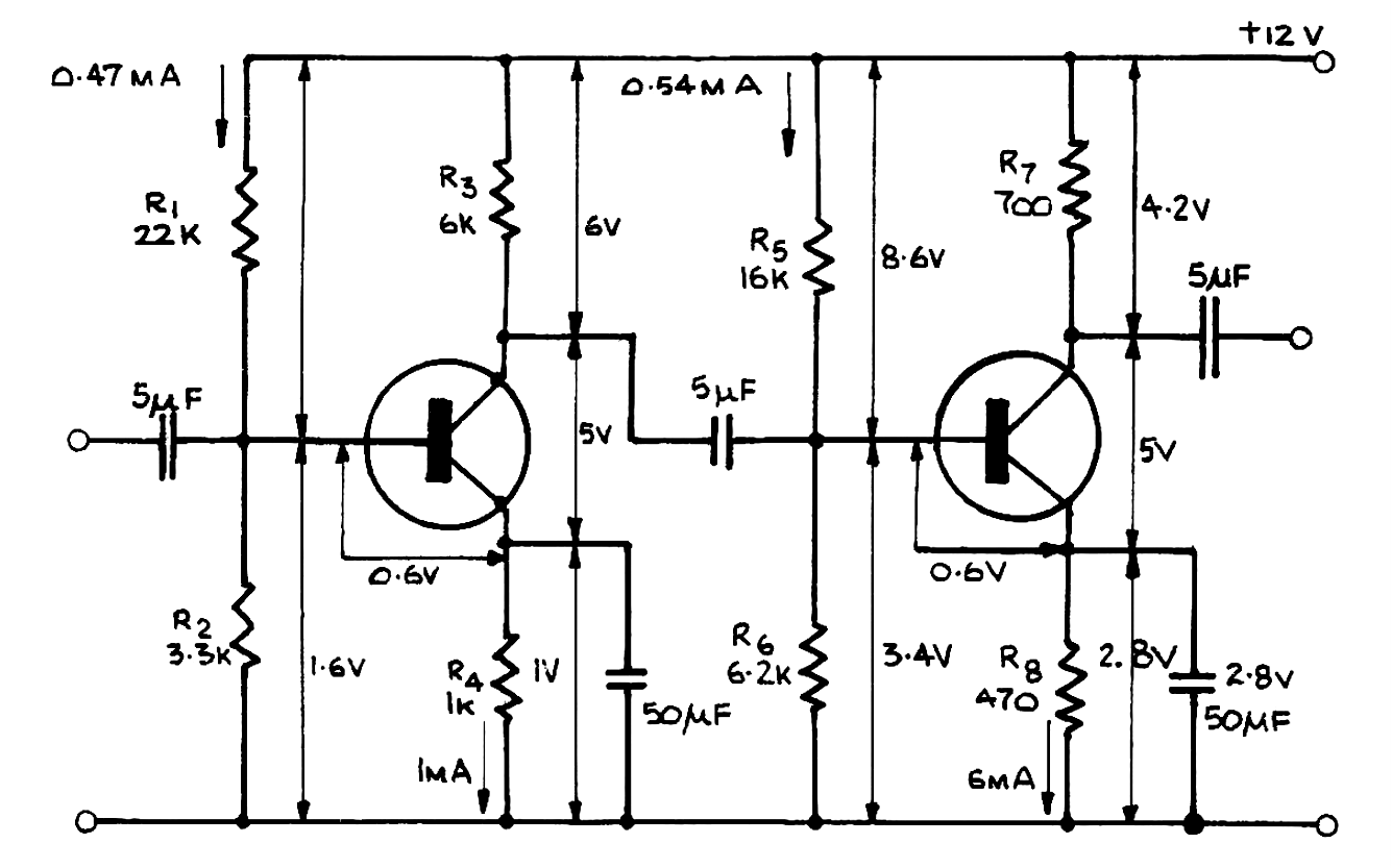 En la figura tenemos un circuito amplificador de dos pasos que muestra las tensiones en varios puntos. Los transistores son NPN de uso general y el circuito tiene una ganancia de voltaje de aproximadamente 880 veces. El circuito es de un libro de A. Fanzeres.