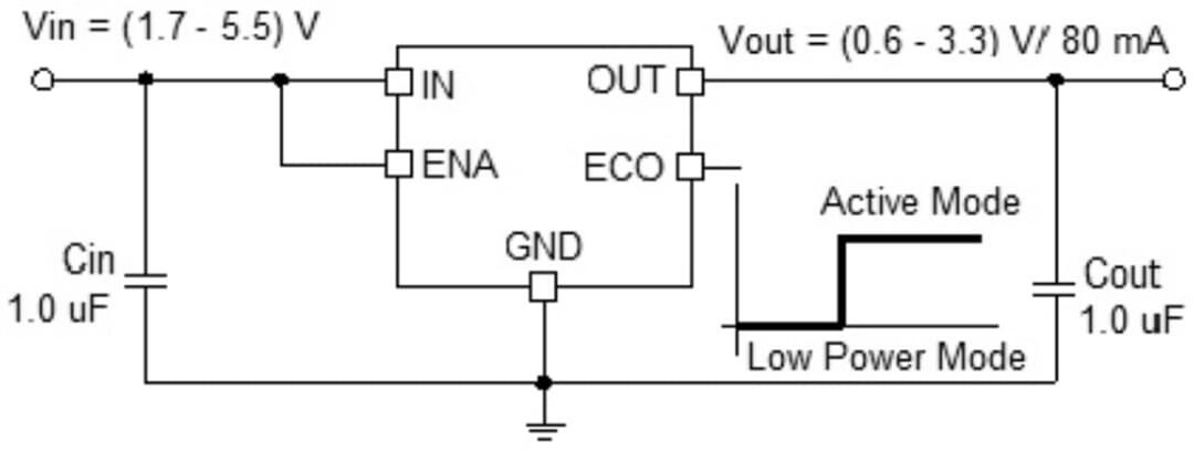 Este regulador de muy baja tensión admite tensiones de entrada de 1.7 V a 5.5 V y es adecuado para IoT y aplicaciones portátiles. El circuito es ON Semiconductor y el circuito integrado utilizado están disponibles en el gabinete SMD.