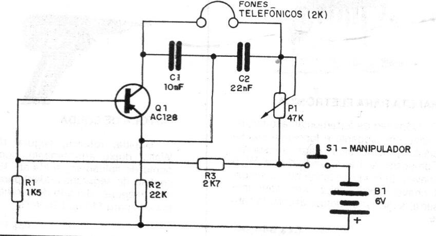 Este oscilador Colpits solo funciona con auriculares magnéticos de alta impedancia. La energía puede ser por batería y se pueden usar transistores equivalentes. Los condensadores determinan la frecuencia y se pueden cambiar.