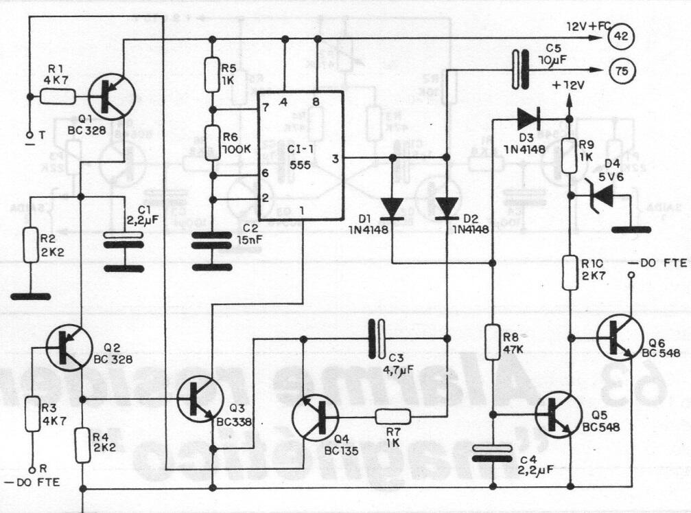 Este circuito de telecomunicaciones se encontró en una documentación de 1987. Conectado al Push to Talk (PTT) del transceptor, emite un pitido cuando se libera al final de la conversación (cambio). El circuito se puede adaptar a varios tipos de transceptores de banda de aficionados y ciudadanos.