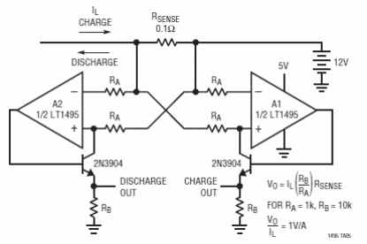 Suministrado en un Manual de Aplicación de Linear Technology de 2005, este circuito monitorea la carga y descarga de una batería. Las fórmulas para calcular los componentes se dan al lado del diagrama. El circuito se aplica a baterías de 12V.