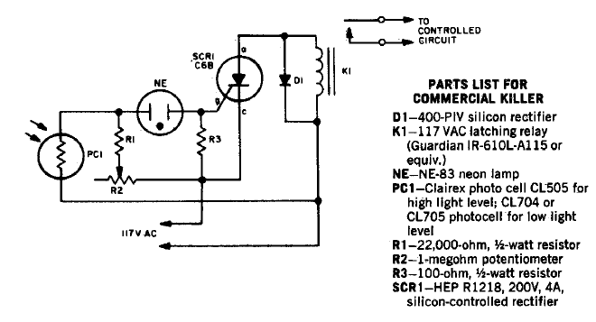 Este circuito se encontró en una vieja revista estadounidense y podría utilizar componentes más modernos como el TIC106 para el SCR y un diac en lugar de la lámpara de neón. El LDR puede ser de cualquier tipo y el relé es de alta tensión para corriente alterna.