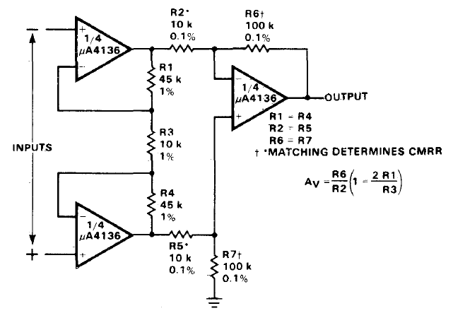 El circuito integrado utilizado en este amplificador diferencial de los años 80 es una versión cuádruple del 741 de la época. El circuito tiene una resistencia de entrada muy alta y requiere una fuente de alimentación simétrica. La ganancia viene dada por los componentes de acuerdo con la fórmula al lado del diagrama.