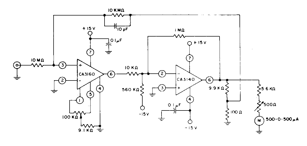 Este circuito de General Electric de los años 80 tiene una guarda de protección contra ruido para el operacional. El circuito tiene una sensibilidad de entrada de 3 pA. La fuente debe ser simétrica.