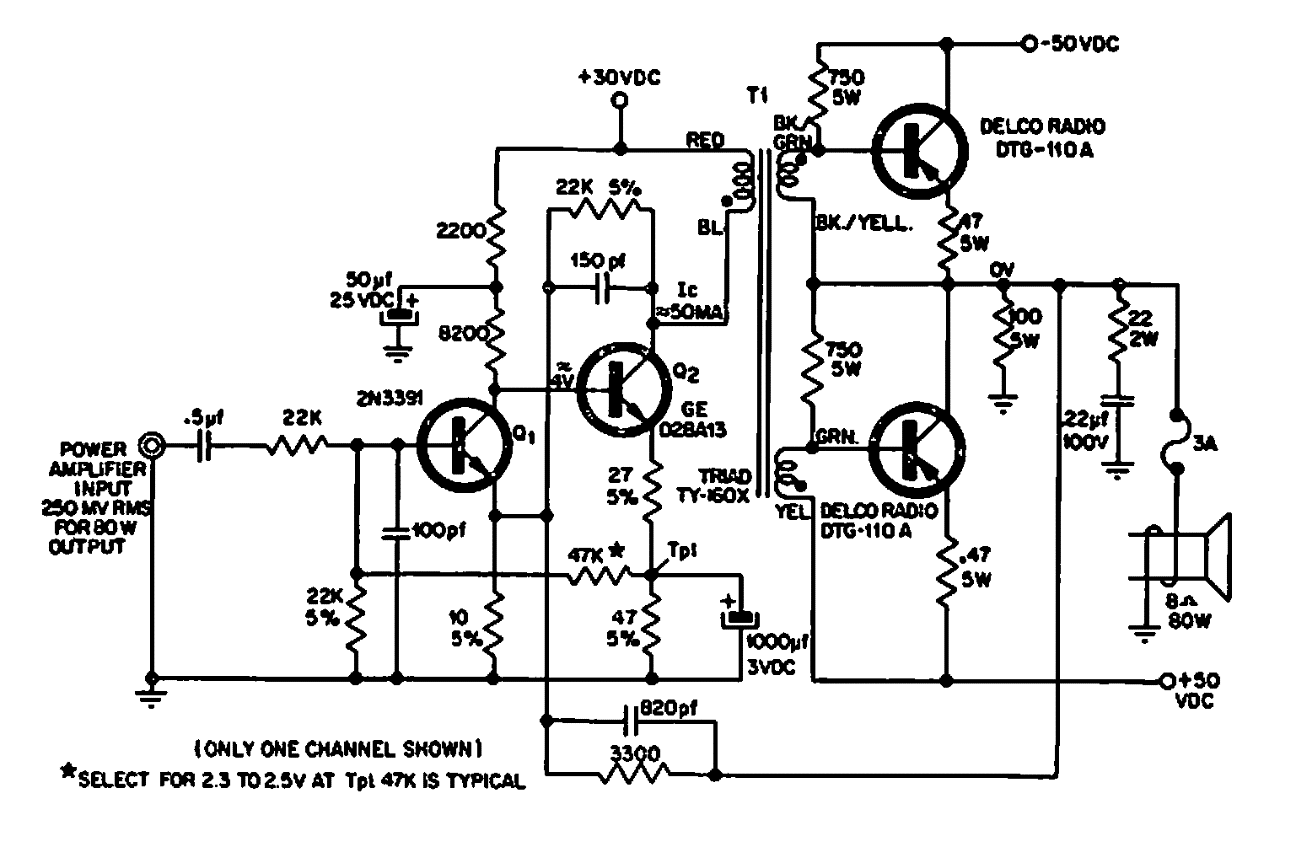 Este circuito es de Delco Radio de 1968. Los transistores son de la época y no reciben información sobre el transformador driver. Tenga en cuenta la alta tensión de alimentación.