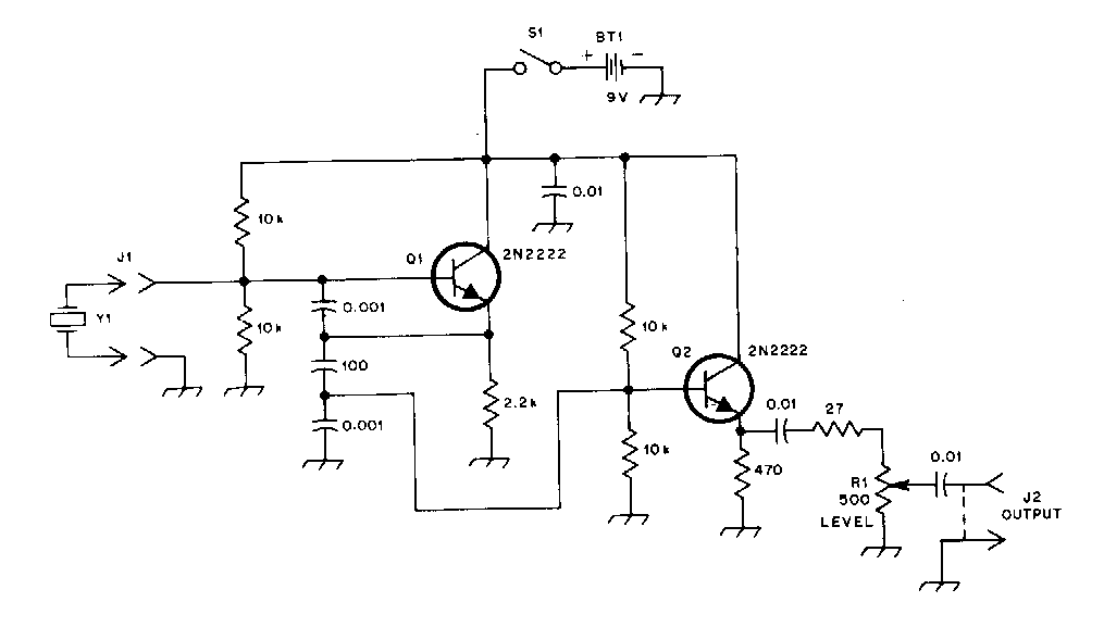 Este circuito se obtuvo de una revista QST de los años 80. El circuito puede generar señales de 1 a 15 MHz con 1 Vpp a 50 ohms de carga. Los transistores usados todavía son comunes hoy en día.
