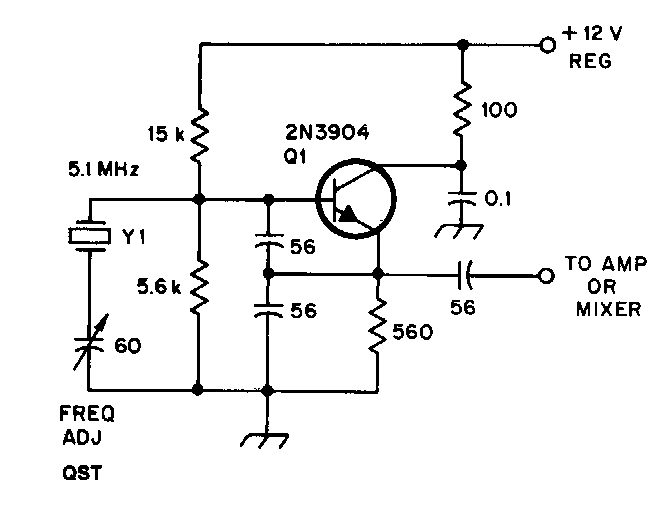 Este circuito de 5,1 MHz se encontró en una documentación de la década de 1980. La frecuencia viene dada por el cristal y los transistores son de propósito general.