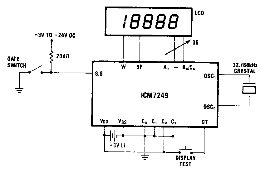 Este circuito puede usarse como un sistema de contraseña de respuesta en una tienda, oficina u otra ubicación. El circuito es de Intersil utilizando componentes de la época. El circuito es de los años 80.
