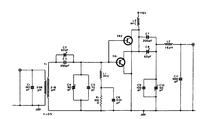 Este circuito de Philips de 1965 utiliza transistores antiguos como el BFY51 y el BFY50. El circuito está alimentado por 12 V y la ganancia de potencia es de 8.9 dB.