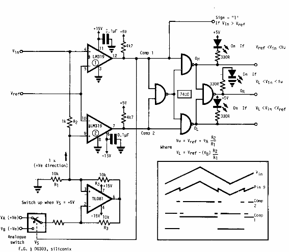 Este comparador sofisticado, que puede tener fines didácticos o prácticos, se encontró en una documentación estadounidense de la década de 1980. El circuito funciona con una fuente simétrica y se puede adaptar para usar componentes modernos.
