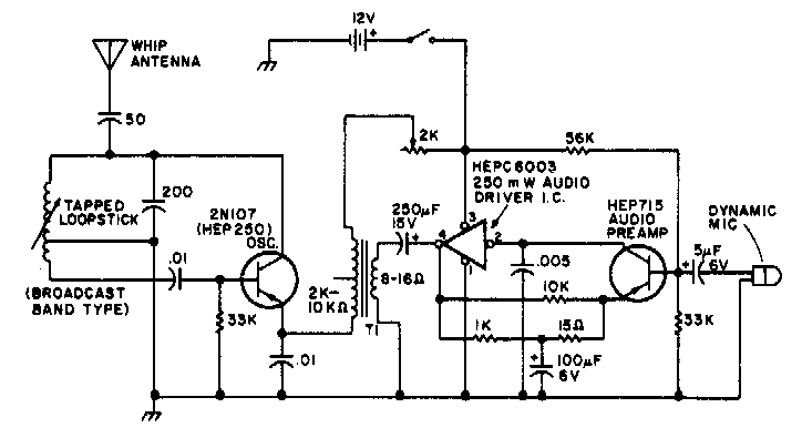 Este circuito fue encontrado en una antigua documentación estadounidense. El transformador es un tipo de salida para radios de transistores y la bobina consta de 60 + 40 vueltas 28 de cable en una barra de ferrita.