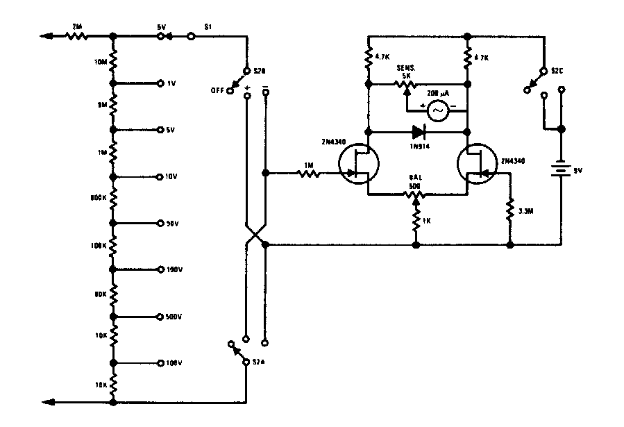 Prácticamente cualquier FET se puede utilizar en este voltímetro que se encuentra en una documentación antigua. El indicador es un microamperímetro de 0-100 µA y la precisión del circuito depende de la precisión de los resistores utilizados.