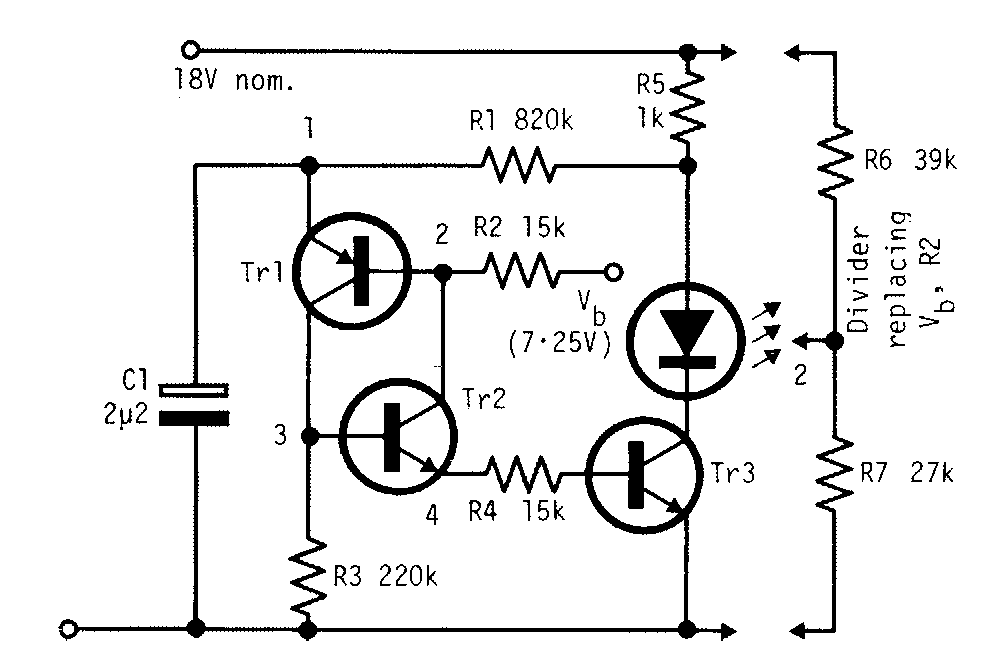 Este pulsador o intermitente se encontró en una Electronics Engineering de los años 80, pero se puede implementar fácilmente con transistores modernos de uso general. La frecuencia depende de C1.