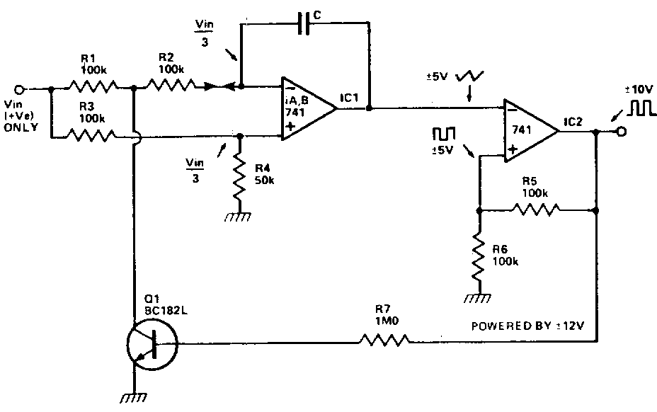 Este circuito se encontró en una publicación en inglés de los años 70. El circuito requiere una fuente simétrica y el transistor es un NPN de propósito general. El capacitor determina la frecuencia generada.