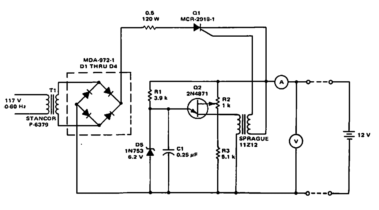 Encontramos este circuito en una publicación de Motorola de 1968. El circuito tiene una corriente de carga de 16 A que determina la corriente del transformador utilizado.