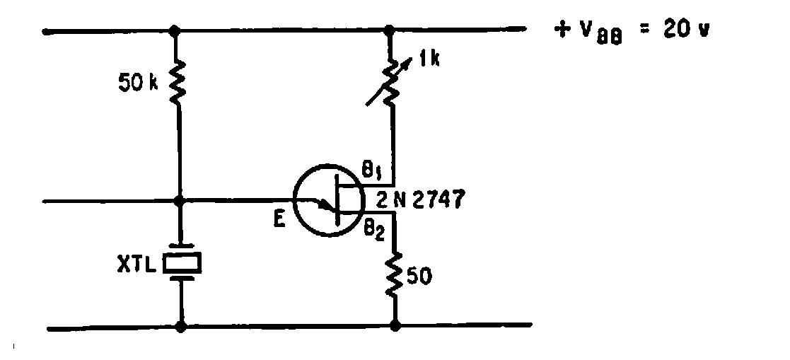 Este clock simple se puede usar para generar señales de hasta 100 kHz, dependiendo del cristal. Lo encontramos en una documentación de 1967. Tenga en cuenta la alta tensión de alimentación.