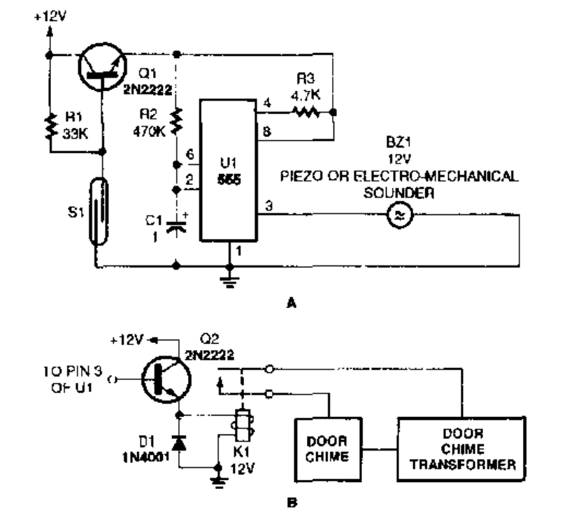 Encontramos este circuito en una Popular Elecrronics de los años 90. El circuito también se puede usar como alarma de cinturón de seguridad. Los componentes utilizados son comunes.