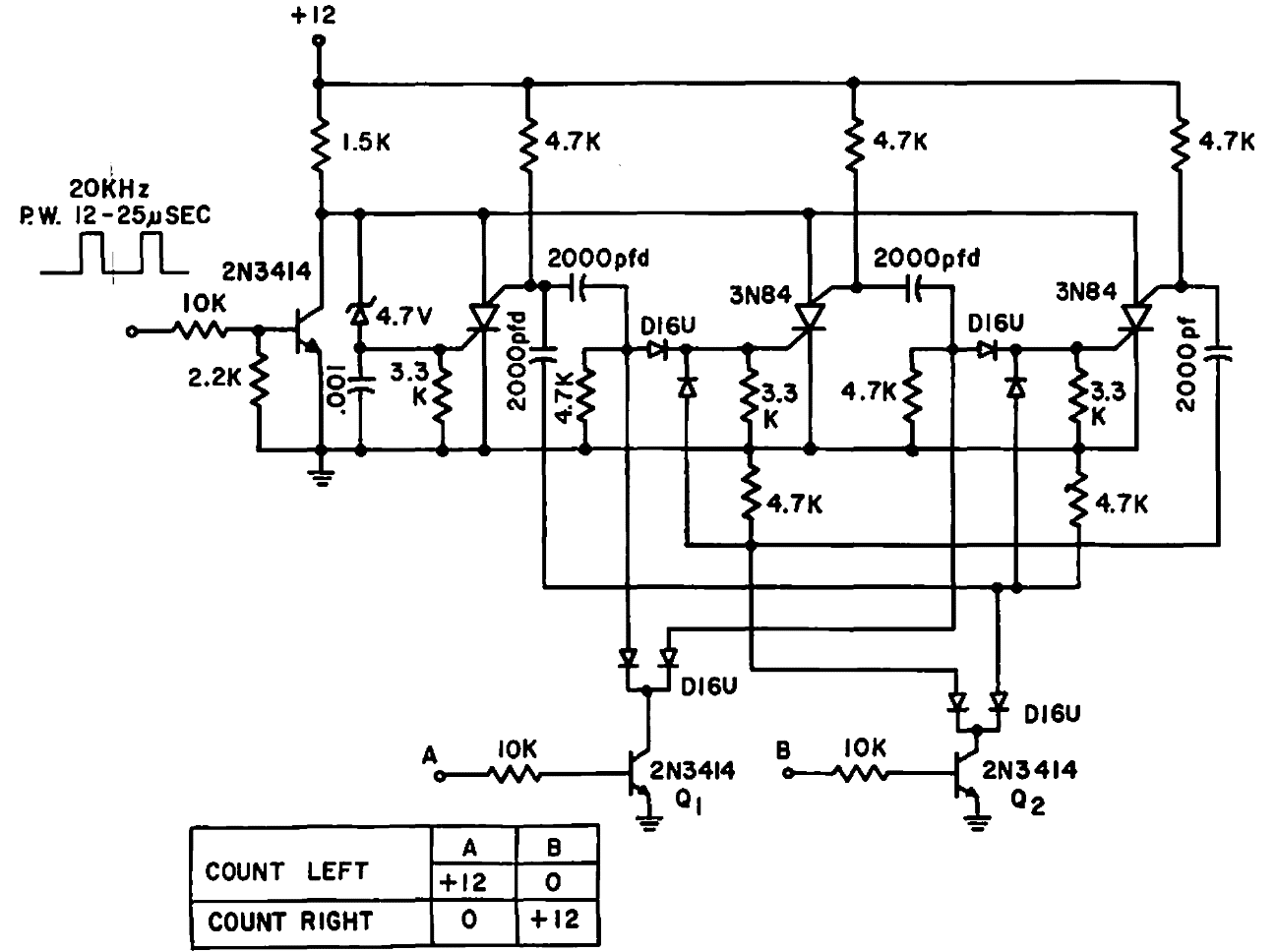 Este circuito se encontró en una documentación de General Electric de 1966. El circuito utiliza PUT que actualmente son componentes poco comunes. La dirección de conteo depende de la programación en A y B.