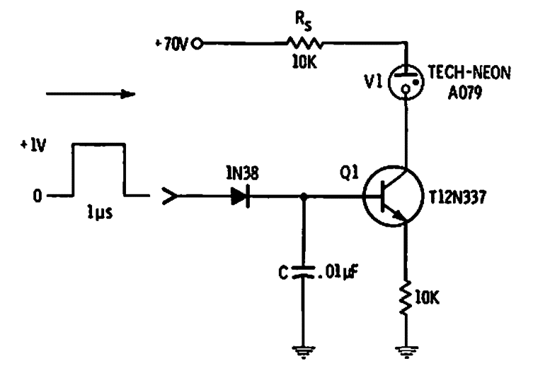 Este circuito mantiene encendida la lámpara de neón por un momento cuando recibe un pulso. El tiempo de activación depende de C. El transistor es del tipo antiguo, de los años 60, cuando se publicó el circuito.