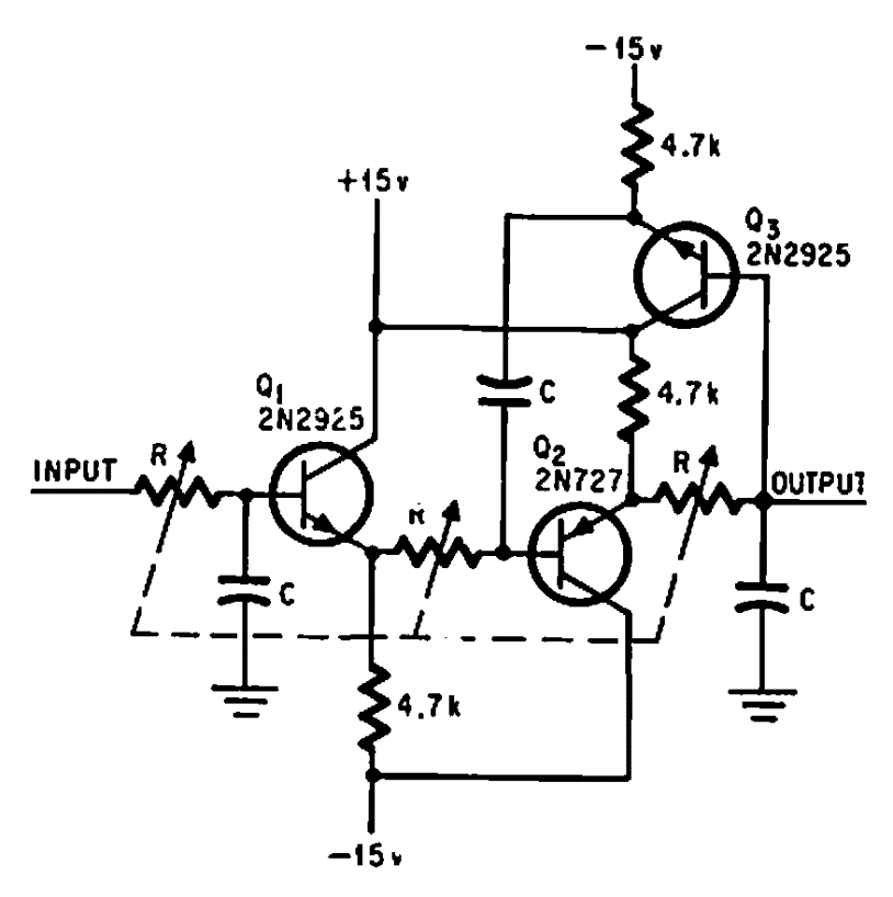 Encontrado en la documentación estadounidense de 1968, este circuito tiene un corte agudo de la frecuencia a la que está sintonizado y que depende de RC. Los transistores pueden ser equivalentes modernos de uso general.