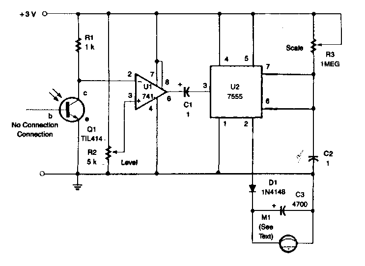 Usando un microamperímetro analógico, este circuito tiene un fototransistor adaptado a la rueda como sensor. El circuito es de documentación estadounidense de la década de 1980, pero los componentes utilizados son comunes hoy en día.