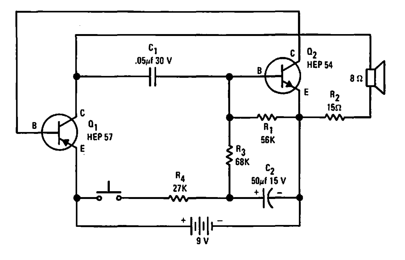 Encontrado en una publicación de Motorola de 1968, este circuito genera un tono de audio de alta potencia cuando se activa. Se pueden usar transistores equivalentes.