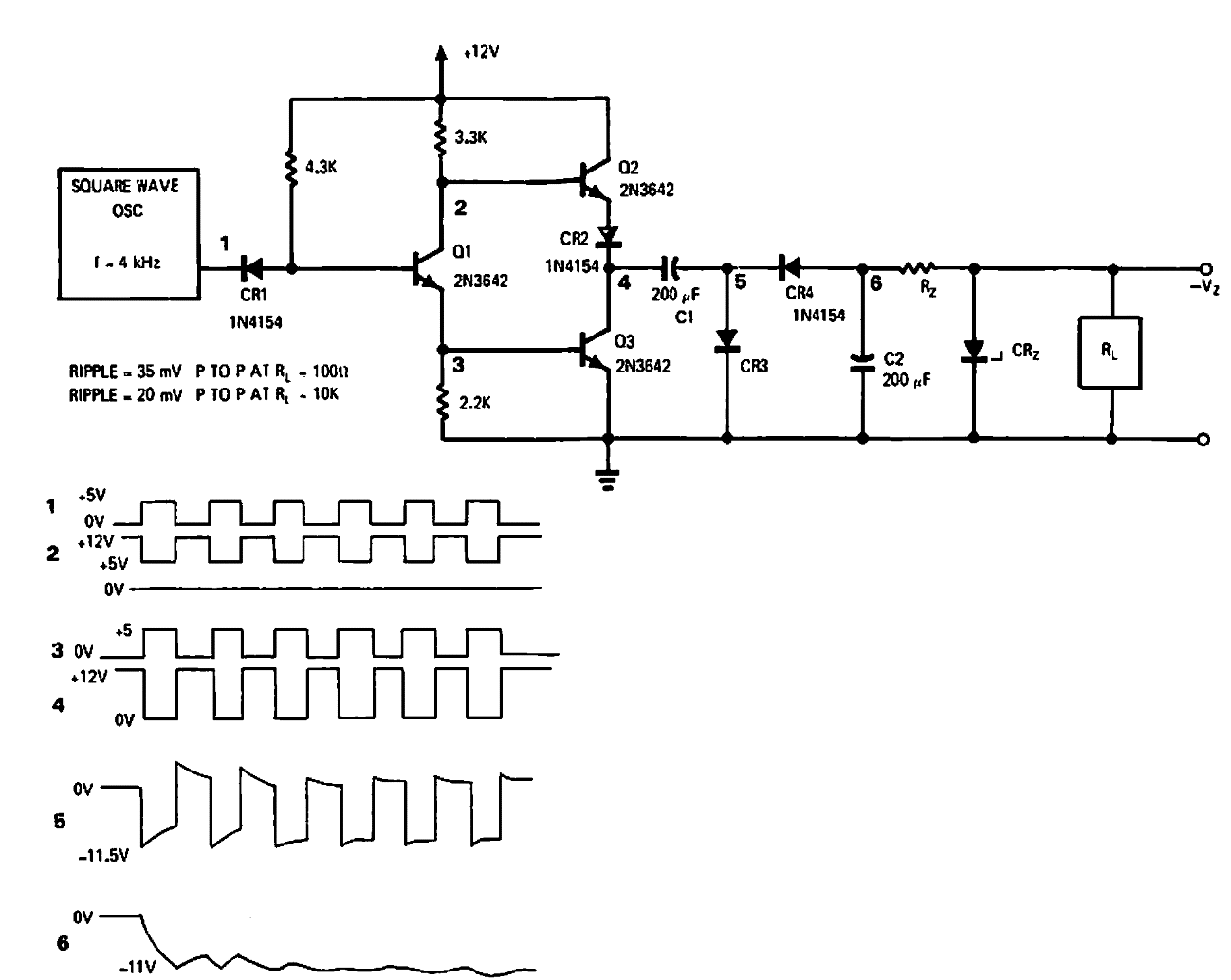 Este circuito proporciona un tensión de salida con aproximadamente el doble de la entrada utilizando dos transistores de potencia y un duplicador de tensión. El circuito es de un EDN de 1970.