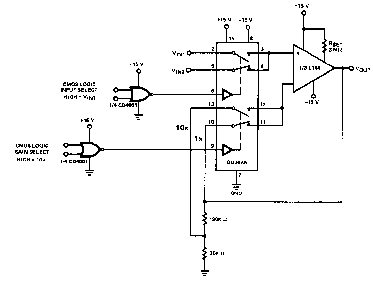 Sugerido por Siliconix en documentación de los años 90, este amplificador tiene su ganancia seleccionada digitalmente. Los componentes son de esa época, no son fáciles de encontrar hoy en día.