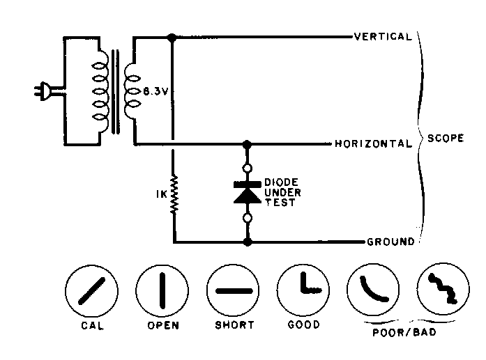 Con este circuito de una electrónica popular de los años 90 es posible probar un diodo con el osciloscopio visualizando su curva característica. El transformador puede tener corrientes de 100 mA o más.