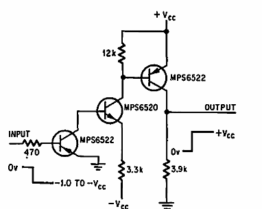 Este circuito convierte las señales lógicas negativas en señales lógicas positivas. Lo encontramos en la documentación de 1969. Se pueden utilizar transistores equivalentes actuales.