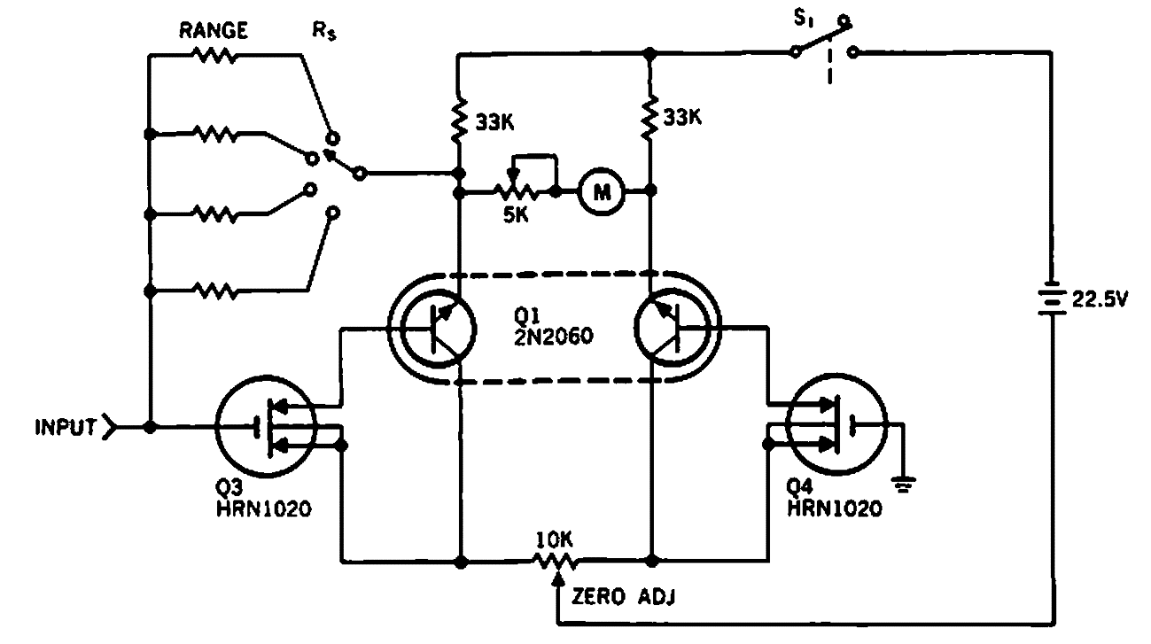 Sugerido por Hughes en una documentación de 1968, este circuito utiliza un par de transistores casados y MOSFET de la época. El circuito es capaz de medir corrientes extremadamente bajas de acuerdo con los valores de derivación utilizados.