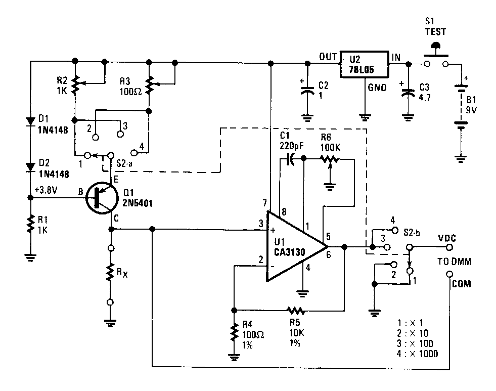 Encontrado en una Hands On Electronics de los años 80, este circuito permite la lectura de bajas resistencias en un multímetro común. El circuito consta de una fuente de corriente constante.