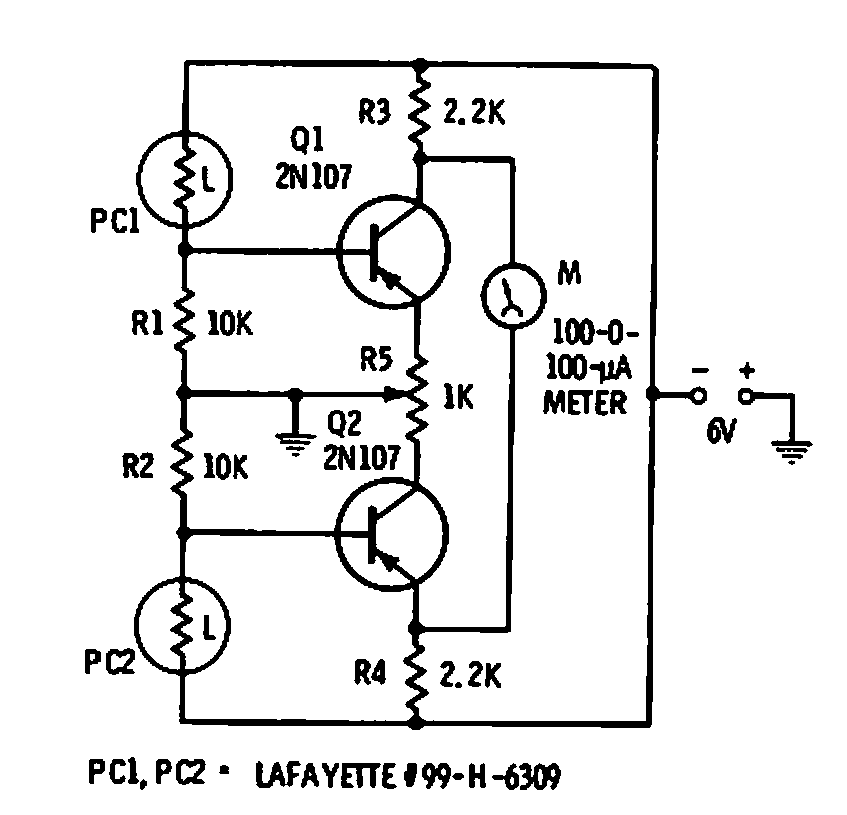 Encontrado en uma Novel Electronic Circuits de 1968, este circuito compara dos intensidades de luz utilizando LDR comunes como sensores. Los transistores pueden ser equivalentes PNP modernos.