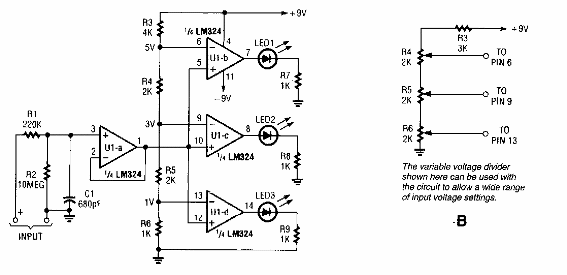 Este circuito comparador de ventanas se encontró en un Popular Electronics de los años 90. El circuito tiene una red de entrada de ajuste múltiple para determinar los rangos de operación.