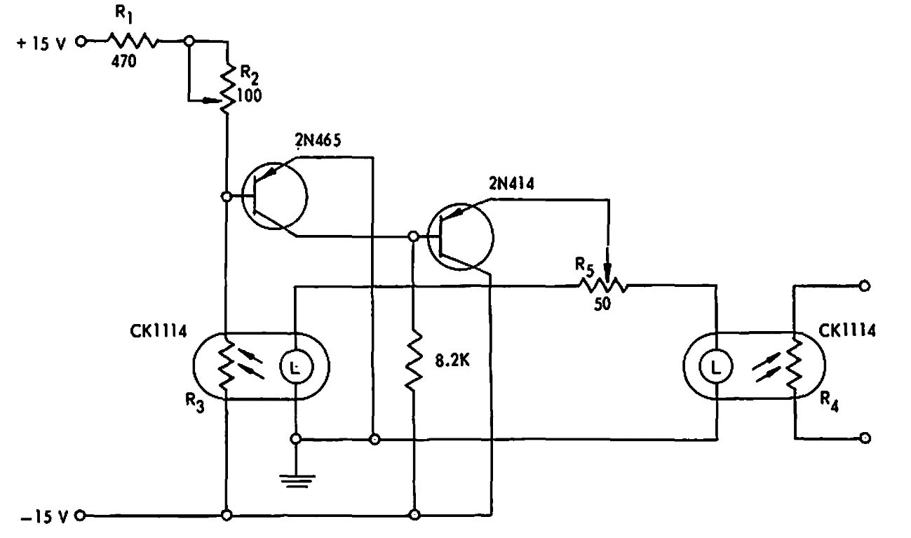 Este circuito se obtuvo en un manual Raytheon de 1967. El componente de la compañía es un acoplador óptico con un fotorresistor y una lámpara. Los transistores admiten equivalentes.