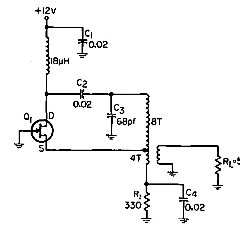 Encontrado en un EEE de 1967, este circuito oscila a 20 MHz de acuerdo con los valores de los componentes utilizados. El FET puede ser de propósito general. La bobina solo ha indicado el número de vueltas.