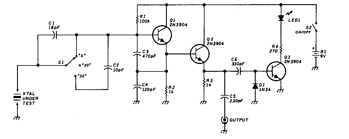 Este probador de cristal fue encontrado en una Ham Radio de los 90. Los transistores se usan comúnmente. El circuito es para probar cristales de 2 a 20 MHz.